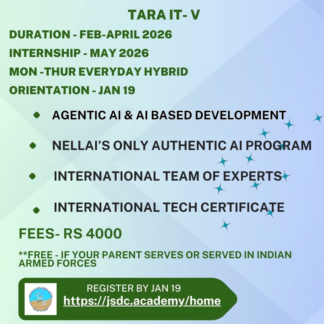 We salute our Armed Forces. Classes are free for their families | EPIC - Nellai's ONLY Job Portal. 3200+ Applicants and growing | New Jobs Posted Everyday at EPIC.jsdc.academy | Incredible websites by TARA IT students | JSDC Signs MOU with Karya